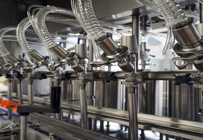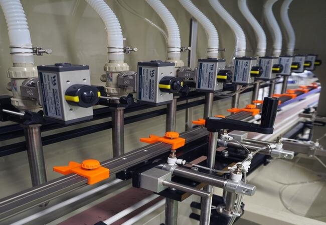 Las boquillas de la llenadora por pistón están ajustadas para asegurarse que la cantidad correcta de shampoo sea llenado en la botella. Esta parte de la línea de llenado llena las botellas de shampoo conforme pasan. Después, las botellas se mueven a la sección de tapado.