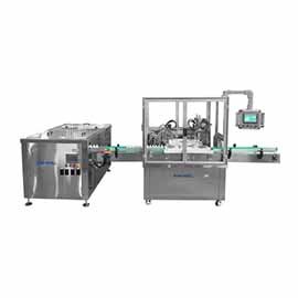 La máquina de llenado y tapado es mecánicamente accionado. El tapón interior y la tapa exterior son presionadas usando un sistema neumático. Para lograr un flujo de proceso sincronizado, use un control neumático eléctrico. Aplique una bomba magnética para el llenado; la boquilla tiene una construcción única mecánica que permite un micro ajuste y reconoce si hay o no botella. Es una máquina de monobloque que opera con electricidad y neumáticamente y es simple de dar mantenimiento.