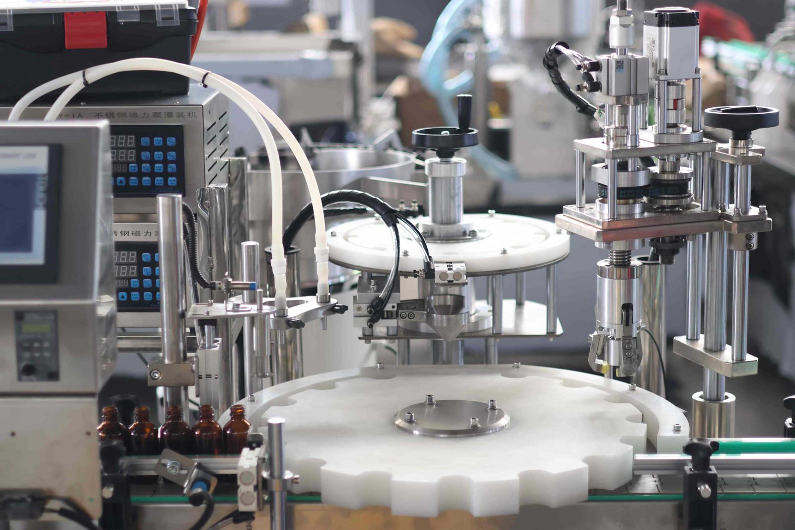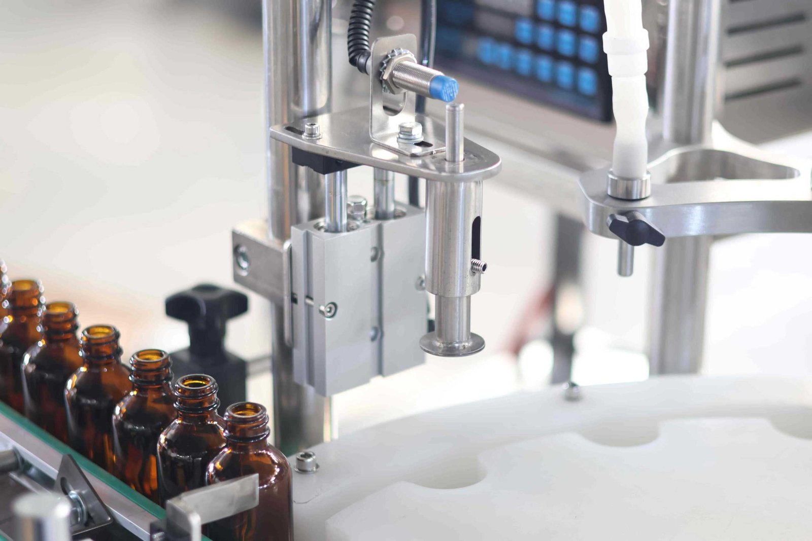 El sensor identifica las botellas limpias cuando son transportadas al área de llenado por la banda transportadora. Después de posicionar los contenedores en la estación de tapado y sellado, la máquina comienza a dispensar el líquido. Después de eso, más botellas vacías son transferidas a la estación de llenado, y el procedimiento se repite.